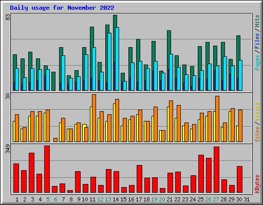 | Day | Hits | Files | Pages | Visits | Sites | KBytes | ||||||